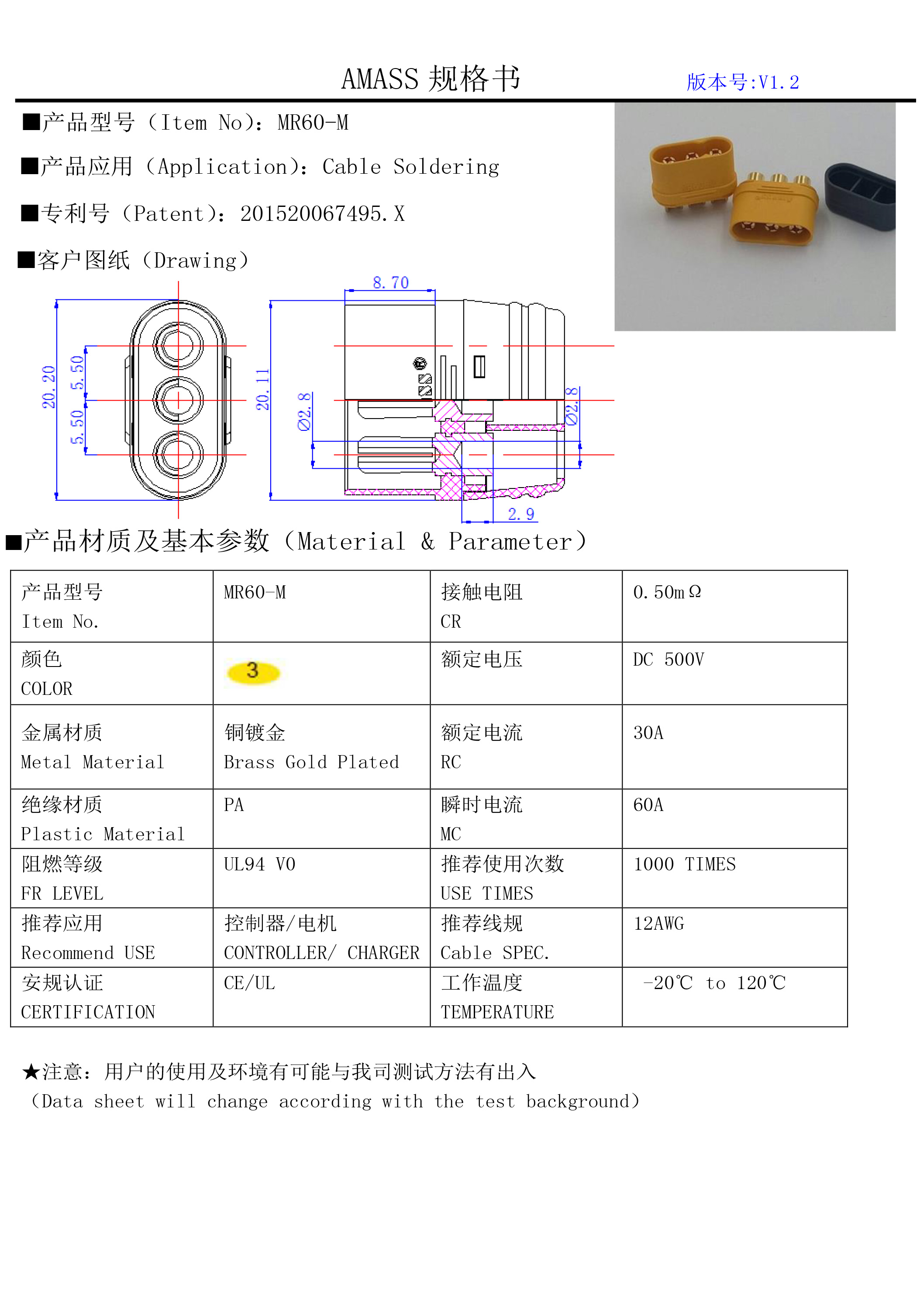 品牌:Amass MR60-F/MR60-M公母插頭連接線